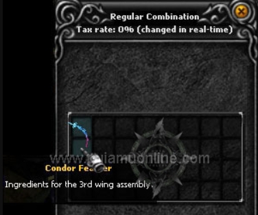 El Condor Feather es necesario para poder crear Wing Level 3 este item no dropea asi que se tiene que crear en la Chaos Machine mediante la combinacion de varios Items.