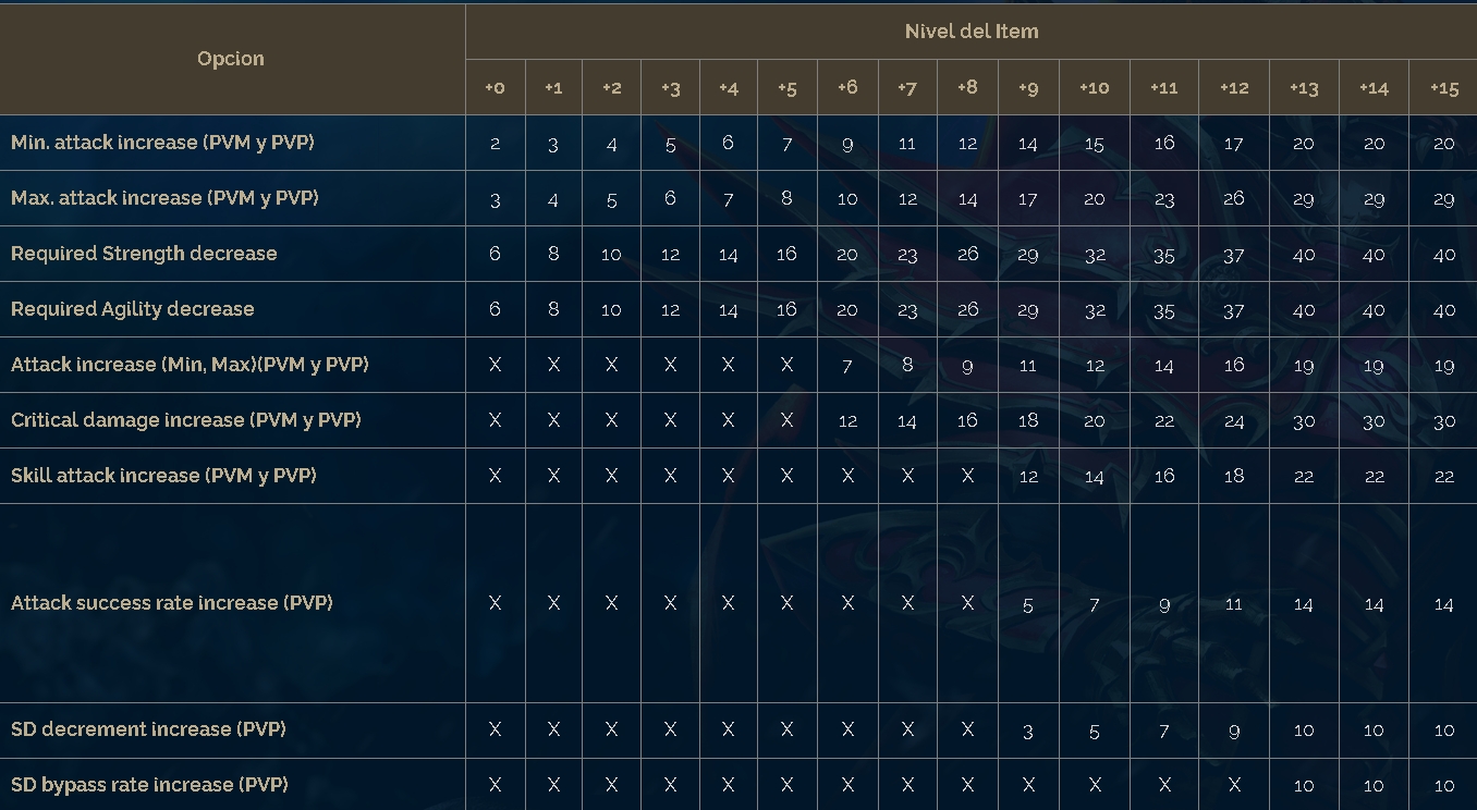 Attack increase (Min, Max)(PVM y PVP): Incrementa el daño minimo y maximo de acuerdo al nivel de reforzamiento.