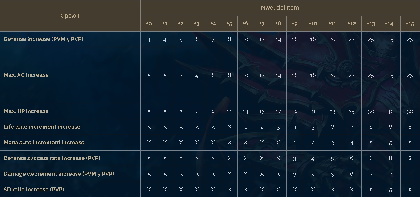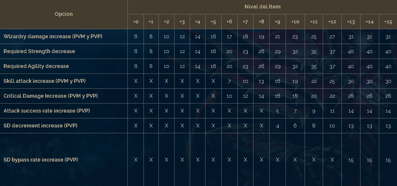 Wizardry damage increase (PVM y PVP): Incremente el Wizardry damage de acuerdo al nivel de reforzamiento.