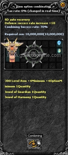 Insertar un Item 380 Nivel Minimo +4+4 Adicional, Jewel of Guardian, Jewel of Harmony y hacer click en Combining.