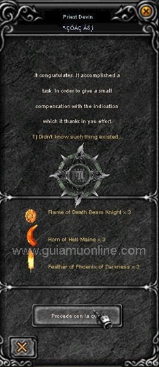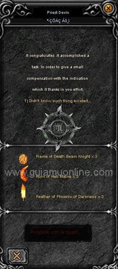 - Condiciones para completarla: Debes de recolectar los 3 objetos que se piden: Flame of Death Beam Knight, Horn of Hell Maine, y una Feather of Phoenix of Darkness.